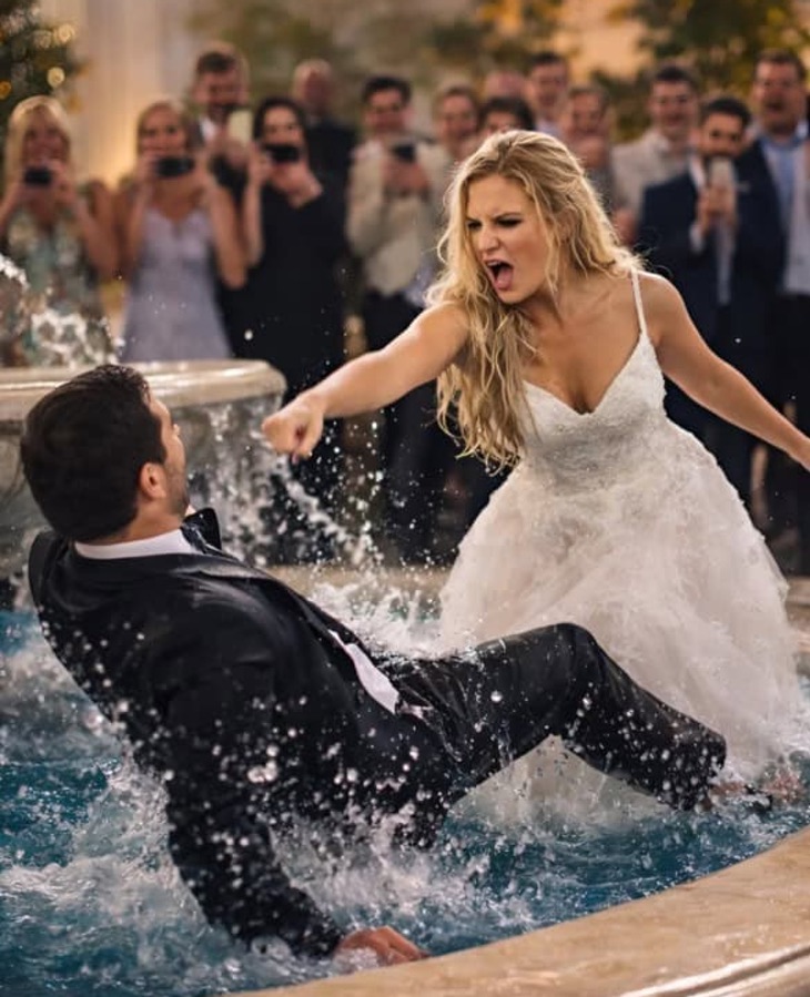 Жених даже не успел понять, что происходит. Через секунду он уже оказался в фонтане, полностью мокрый, в дорогом костюме, который тут же прилип к телу.
