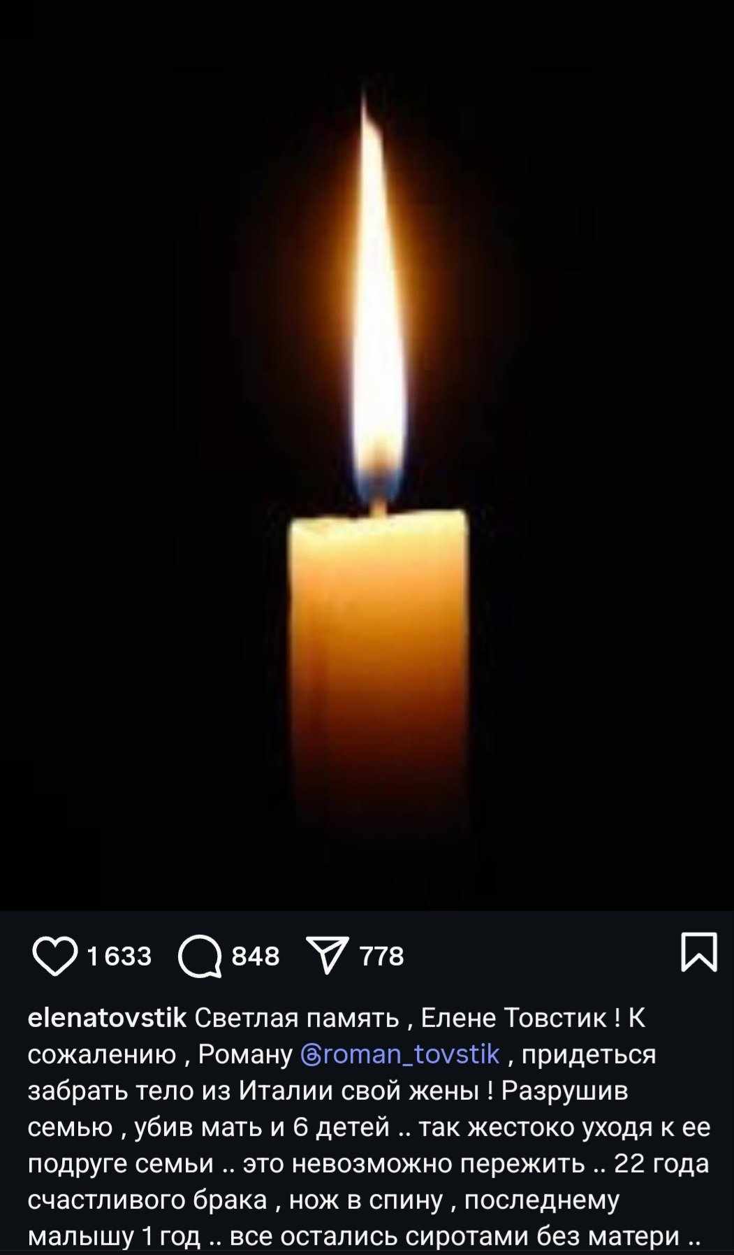 Жена Товстика пытается манипулировать мужем. Последний тревожный пост Елены всполошил пользователей сети. Женщина написала, что ее муж “оставил сиротами 6 -х детей”, заявив, что Роману придется “забрать ее теnо из Италии”.